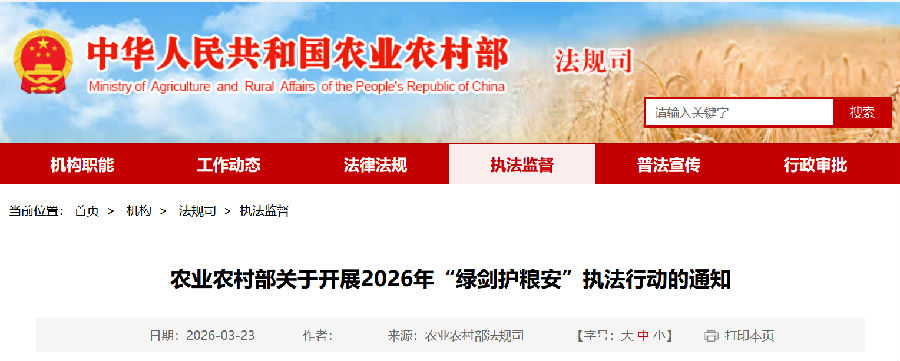 为充分发挥农业执法服务保障“三农”发展作用,依法严厉打击坑农害农、危害粮食安全和农产品质量安全违法行为,维护农民群众合法权益,守护人民群众“舌尖上的安全”,持续夯实国家粮食安全根基,农业农村部决定开展2026年“绿剑护粮安”执法行动。现将有关事项通知如下。